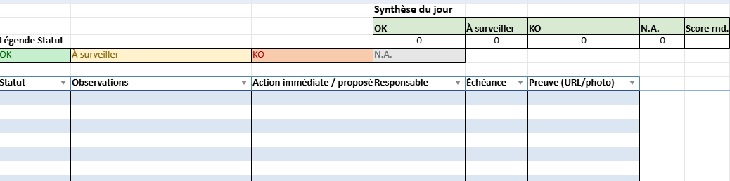 - Barème simple : OK / À surveiller / KO / N.A. + un champ “action immédiate”.