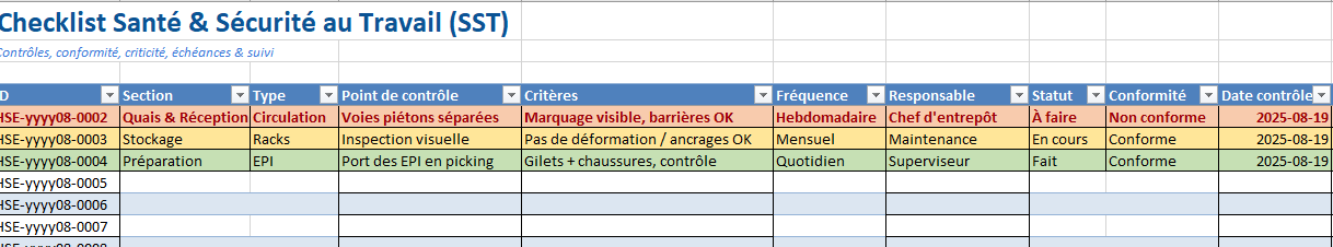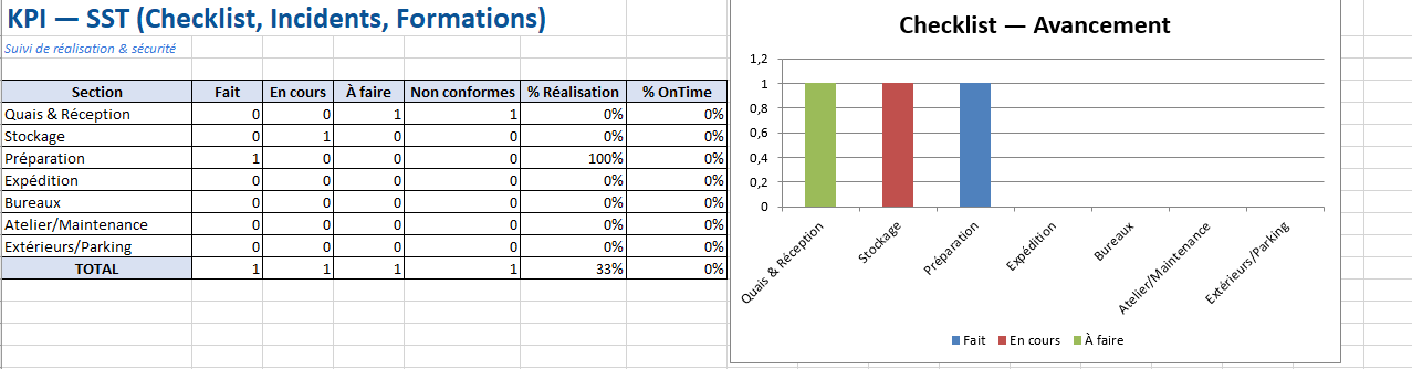 - Checklist SST : points de contrôle par Section/Zone (Quais, Stockage, Préparation, Expédition, Bureaux, Ateliers…).