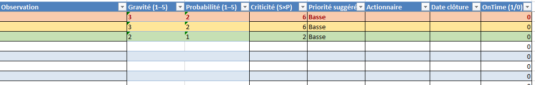 - Menus déroulants, échéances, jours restants, statut, conformité et criticité (S×P) avec priorité suggérée.