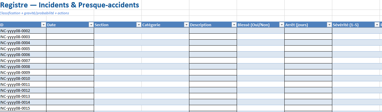 - Enregistrez vos incidents, équipements, formations (quelques lignes d’exemple sont posées).