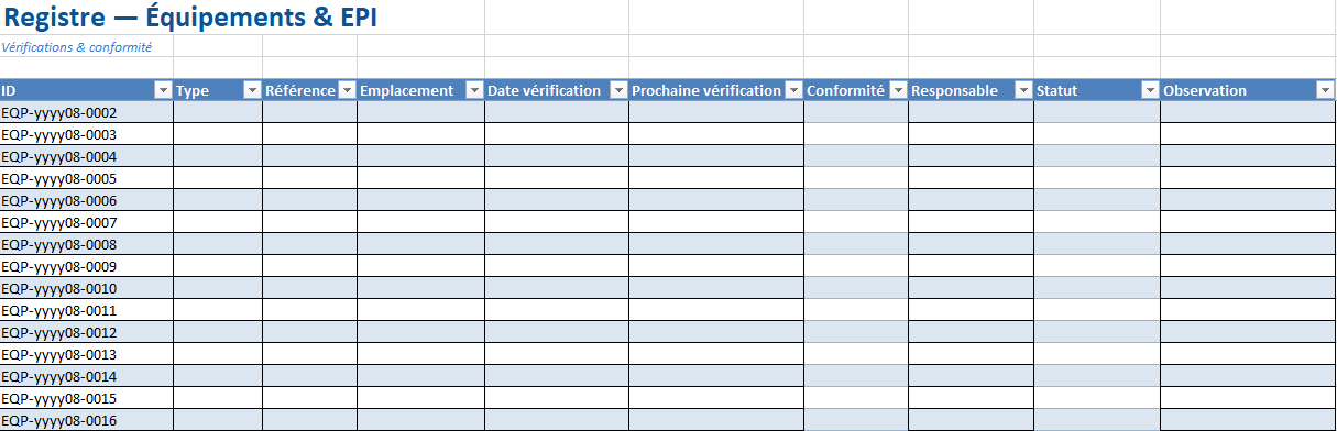 - Suivi des vérifications : date faite, prochaine date, conformité, statut, observation.