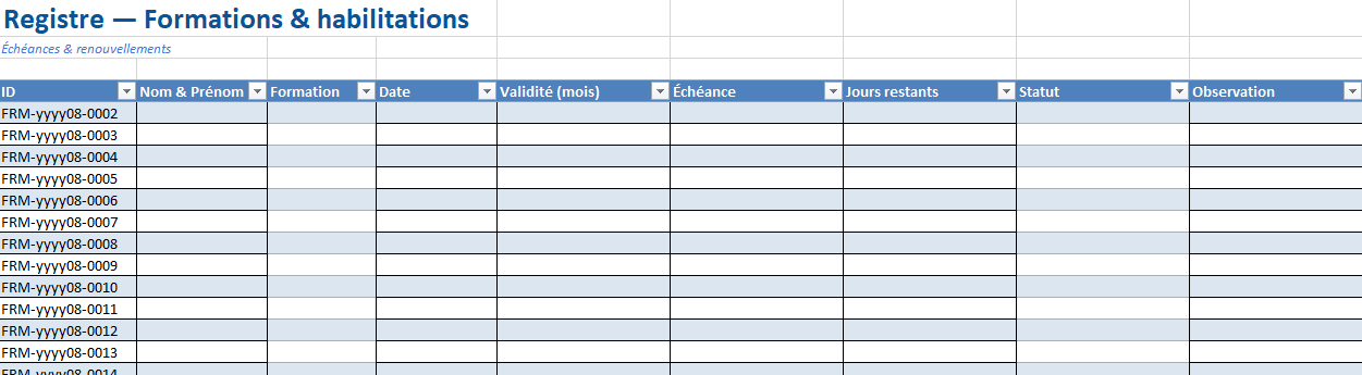 - Formations : indiquer la validité (mois) → échéance & jours restants auto.