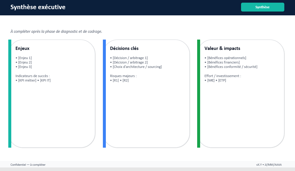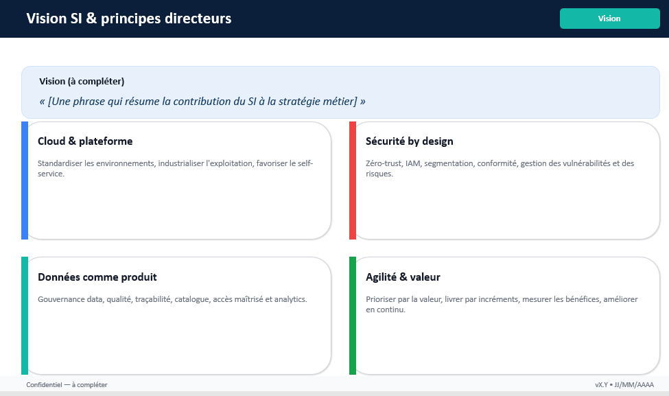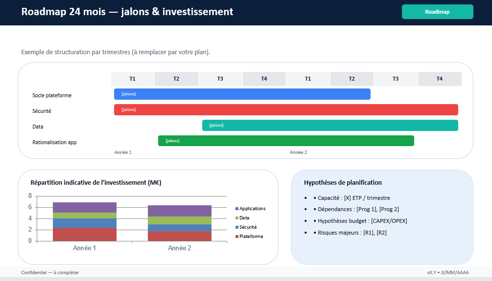 Chaque slide est pensée pour aider à arbitrer : on voit rapidement les priorités, les dépendances, les risques et les indicateurs de réussite. Résultat : vous pouvez l’utiliser tel quel pour animer un comité de direction, ou le transformer en document “référence” qui cadre les décisions SI sur 12 à 36 mois.