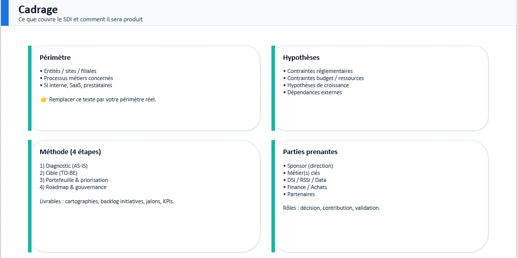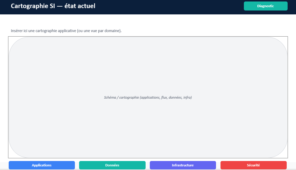 - Diagnostic AS-IS (apps, data, infra, cyber, organisation)
