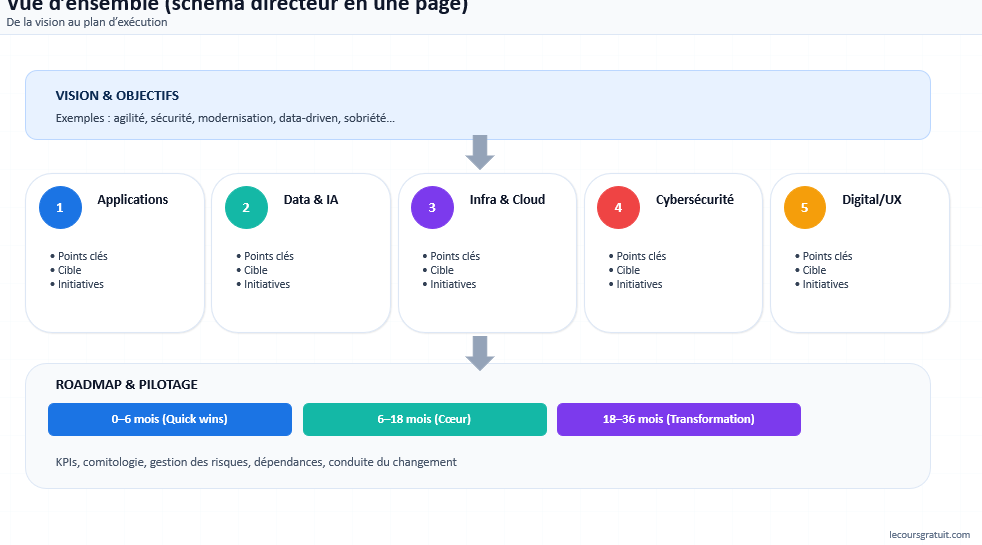 La cible n’est pas un “SI parfait”. C’est un SI suffisamment robuste pour l’ambition de l’organisation. On définit des principes d’architecture (urbanisation, intégration, API, référentiels), des choix structurants (cloud hybride, data platform, IAM, monitoring), et un modèle de gouvernance (qui décide, qui arbitre, qui contrôle).