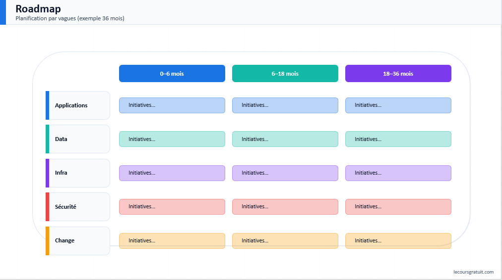 La roadmap n’est pas un Gantt “idéal”. Elle raconte une logique : fondations d’abord, accélération ensuite. Souvent, une trajectoire réussie suit trois vagues :