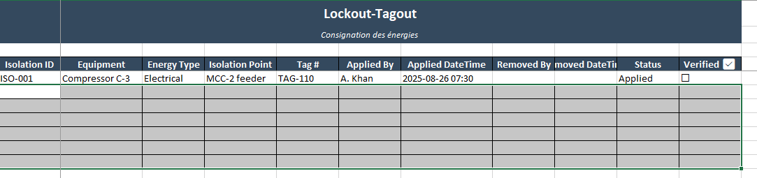- Données : Energy Type, Isolation Point, Tag#, Applied/Removed DateTime, Verified ☑.