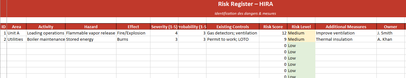 - Données : Area, Activity, Hazard, Severity (1-5), Probability (1-5), Due Date, Owner, Status.