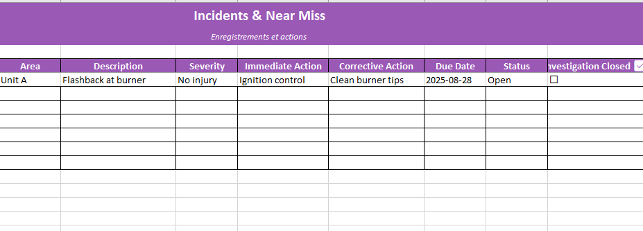 Champs : Date, Type, Area, Description, Severity, Immediate Action, Corrective Action, Due Date, Status, (PLUS : Investigation Closed ☑).