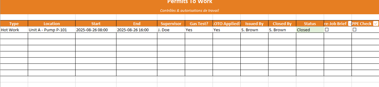 - Données : Type (Hot Work/Confined Space…), Gas Test, LOTO Applied, Pre-Job Brief ☑, PPE Check ☑, Fire Watch ☑, Status.