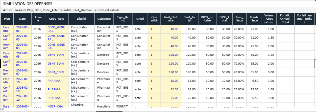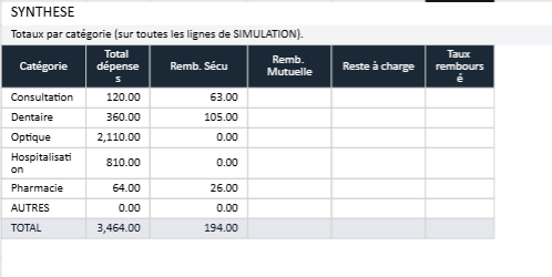 - Calcul des Remboursements : Utilisez des formules pour calculer les montants remboursés par la Sécurité sociale et la mutuelle.