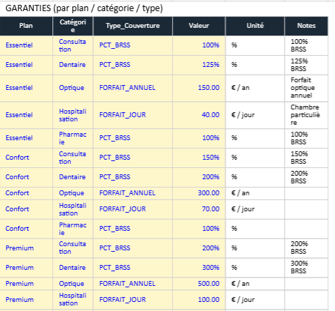 Tableau des garanties par Plan (Essentiel, Confort, Premium…) et Catégorie :- pour
