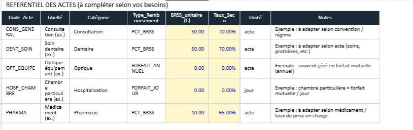 - Pour un résultat fiable, alignez le référentiel ACTES_REF et les garanties CONTRATS avec vos documents (devis, tableaux de garanties, décomptes).