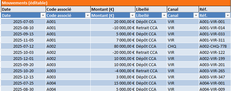 - Mouvements : journal des dépôts/retraits (date, associé, montant).