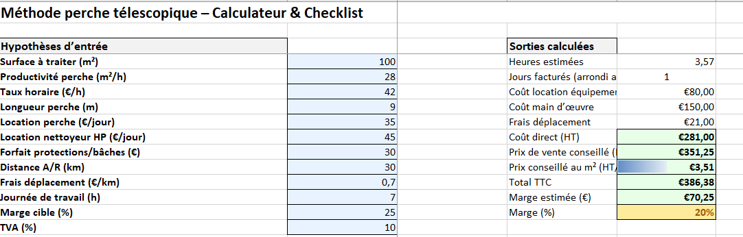 Onglet “perche nettoyage toiture” : calcul méthode perche télescopique (m²/h, jours, location perche & HP, déplacement, marge cible) → prix conseillé HT et €/m².