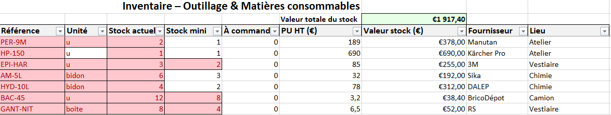 En pratique, cela signifie prendre le temps, une fois par semaine ou par quinzaine, de mettre à jour son tableau de stock : noter ce qui sort, ce qui arrive au seuil mini, ce qu’il faut commander avant la prochaine vague de chantiers. Ce n’est pas la partie la plus spectaculaire du métier, mais c’est celle qui permet de partir le matin avec la certitude que tout le nécessaire est dans le camion.