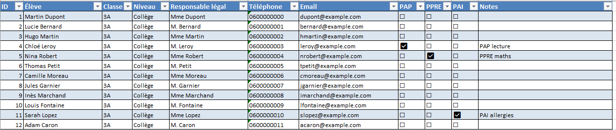 Liste_Élèves ressemble à une fiche papier rangée proprement : ID, Élève, Classe, Niveau, Responsables, Contacts et trois colonnes PAP/PPRE/PAI avec cases ☑/☐. On ne sur-documente pas ; on balise. Cette liste nourrit le reste : sans elle, pas de synthèse par élève.