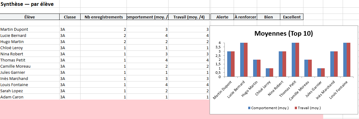 En miroir, “Points_Positifs” évite le biais du négatif permanent. Récompenser “Aide aux camarades” ou “Effort soutenu” construit du possible. Dans la durée, l’équilibre incidents ↔ mérites raconte autre chose que le seul “problème”.