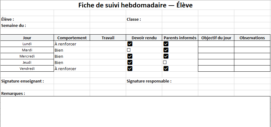 Suivi en classe du comportement et du travail de l’élève — multi-feuilles : modèle Excel + fiche imprimable