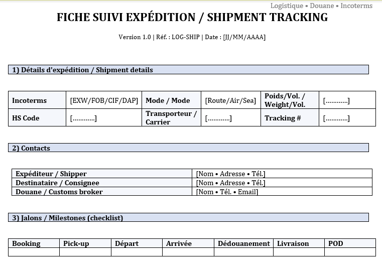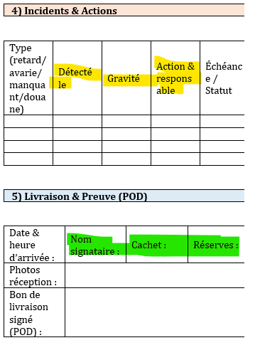 - Incoterm & Lieu — Mode (Route / Air / Mer) — Transporteur / N° tracking — Référence booking
