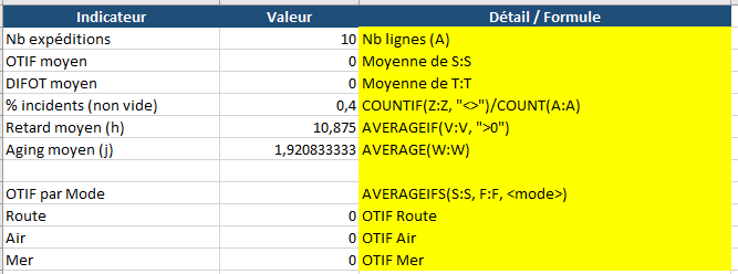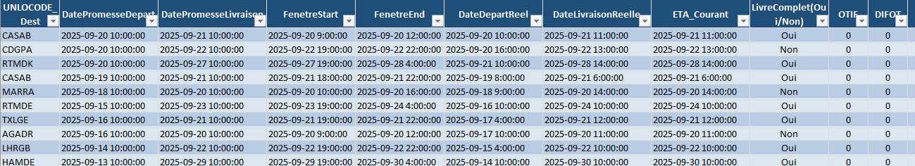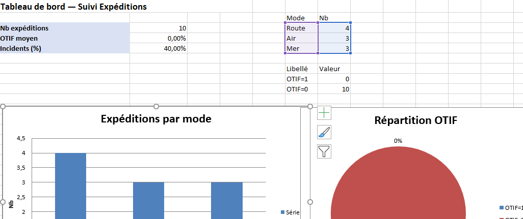 - Mise à jour KPI : OTIF, transit time, causes de retard