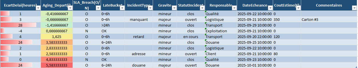 L’incident a une nature (retard, manquant, douane…), une gravité (mineur/majeur), un statut (ouvert/en cours/clos), un responsable, une échéance, parfois un coût.