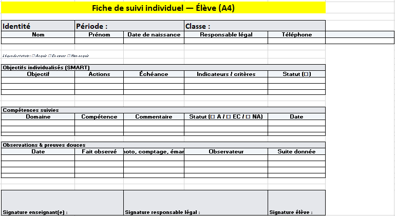 La fiche élève commence par l’objectif SMART (spécifique, daté, observable). Viennent ensuite la table A / EC / NA par compétence, puis une zone « Observations & preuves douces » et un espace signatures. L’idée n’est pas de tout écrire ; l’idée est d’écrire ce qui fera foi au prochain point.