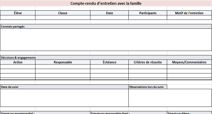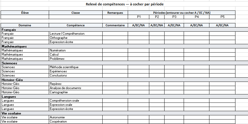Le pack papier fonctionne comme une trousse : une fiche élève (identité, un objectif SMART, compétences A/EC/NA, zone pour les « preuves douces »), un relevé de compétences (paysage, P1→P5), une page absences/retards avec signature parentale quand c’est utile, un compte-rendu d’entretien qui transforme les constats en actions datées, un petit contrat d’objectifs qui précise qui fait quoi et comment on jugera la réussite, puis une synthèse annuelle sans littérature inutile. Chaque feuille a une fonction unique ; aucune n’exige un mode d’emploi interminable.
