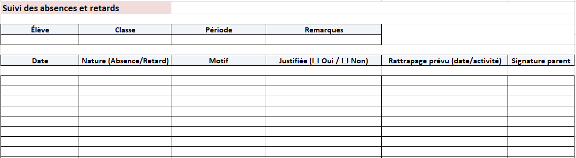 Télécharger un Modèle dynamique (Excel) Suivi individuel de l’élève – Pack 100 % imprimable (A4) — fiche élève, bilan période, relevé compétences, absences/retards, entretien famille, contrat d’objectifs, synthèse annuelle 👇👇