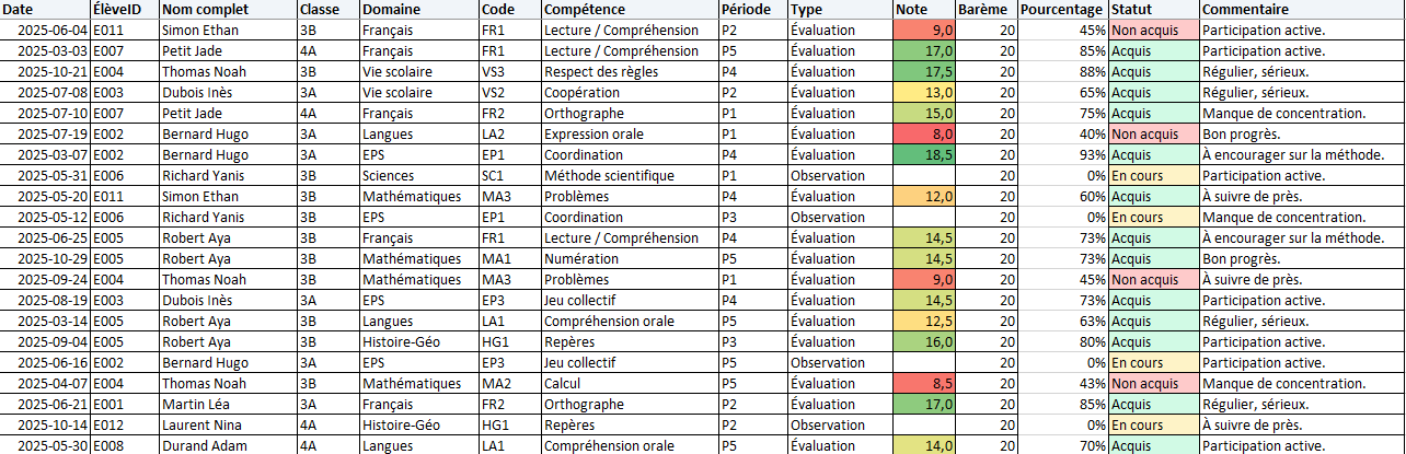 Le Suivi (journal) devient votre carnet de bord. On choisit l’élève, le domaine et la compétence dans de simples listes, on précise la période et le type d’événement, et le pourcentage se calcule tout seul. Les notes et les statuts se colorent automatiquement : d’un coup d’œil, vous voyez ce qui avance, ce qui patine, ce qui demande un retour.