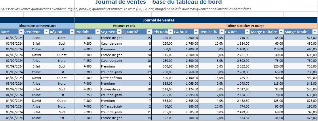 À partir de ces éléments, Excel calcule automatiquement le chiffre d’affaires brut, le CA net après remise et la marge totale de chaque ligne. La direction commerciale n’a plus à reconstituer les résultats à partir de plusieurs fichiers : le journal devient la source unique de vérité.