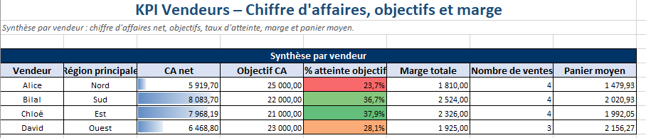 La mise en couleur et les barres de données transforment ces indicateurs en signaux visuels : une ligne fortement colorée sur le taux d’atteinte attire immédiatement l’œil, un panier moyen anormalement bas alerte sur une politique de remises trop généreuse. Le baromètre vendeurs n’est plus un simple classement ; il devient un outil de coaching et de pilotage.