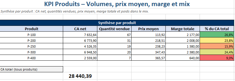 La feuille KPI_Produits synthétise, pour chaque référence :