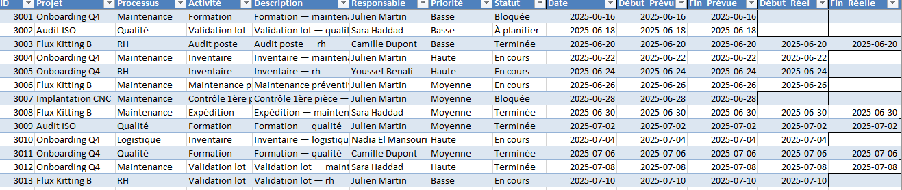 Le tableau de bord ne vaut que par sa capacité à faire dialoguer des univers qui, trop souvent, s’ignorent : production, maintenance, qualité, logistique, RH. En proposant une grammaire commune—des statuts normalisés, des dates prévues et réelles, des charges prévues et constatées, un responsable clairement identifié—il transforme l’inventaire des tâches en file d’attente lisible.