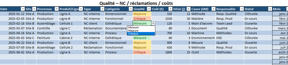 - Champs clés : Date, Site, Processus, Produit/Ligne, Type (NC interne/NC client/Réclamation), Catégorie (Dimensionnel, Process, …), Gravité (Mineure/Majeure/Critique), Coût (€), Délai (j), Cause (6M), Responsable, Statut.