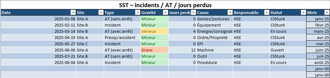 - Champs clés : Date, Site, Type (Incident/Presqu’accident/AT…), Gravité (Mineur/Sérieux/Grave), Jours perdus, Cause, Responsable, Statut.