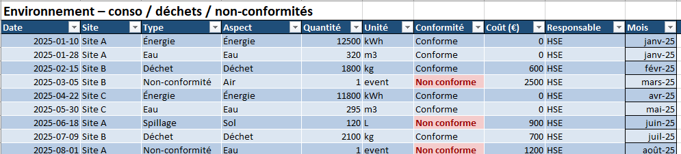 - Champs clés : Date, Site, Type (Énergie/Eau/Déchet/Spillage/NC…), Aspect (Air/Eau/Sol/Énergie/Déchet/Bruit), Quantité + Unité (kWh/m³/kg/L/event), Conformité (Conforme/Non conforme), Coût (€), Responsable.