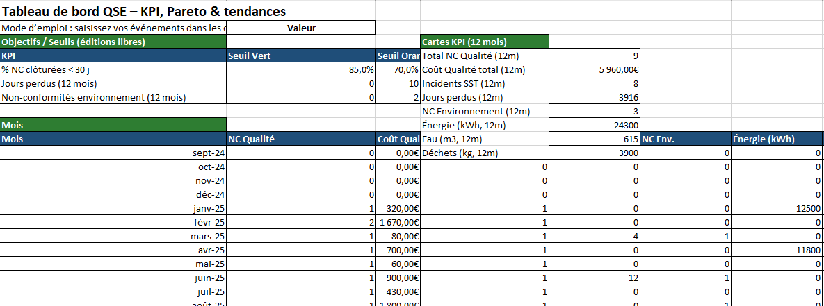 - Cartes KPI 12 mois (somme NC, coûts Qualité, incidents, jours perdus, NC env., énergie/eau/déchets).
