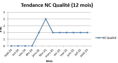 - Délai & réactivité : possibilité de calculer % NC clôturées < 30 j (si dates d’ouverture/clôture saisies).