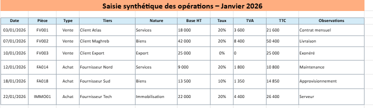 Les feuilles suivantes donnent corps à ce cadrage. Les opérations sont présentées de manière synthétique, avec des montants réalistes et des cas variés : ventes, achats, opérations exonérées, immobilisations. Rien n’est laissé au hasard. Chaque ligne raconte une situation que l’on retrouve réellement dans une entreprise. L’objectif n’est pas d’impressionner, mais de permettre une lecture fluide et crédible.