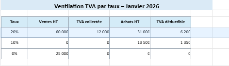 La ventilation par taux joue un rôle clé. Elle met en évidence la structure de la TVA, non seulement son montant. Elle permet de voir immédiatement si un taux est surreprésenté, si une déduction est concentrée sur un type d’opération, ou si une exonération pèse sur l’équilibre global. C’est souvent à ce niveau que les incohérences apparaissent, et le modèle a été pensé pour cela.