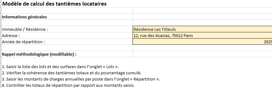 « Modèle de calcul des tantièmes locataires » - Zone à remplir (en jaune) :