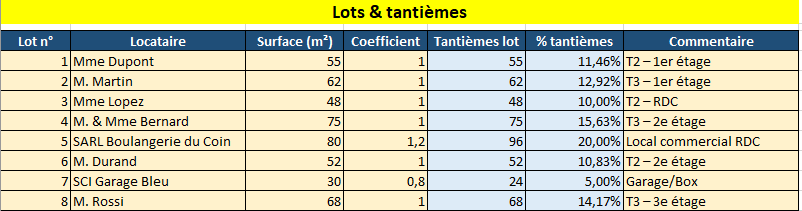 - % tantièmes = tantièmes du lot ÷ total des tantièmes (tous lots confondus)