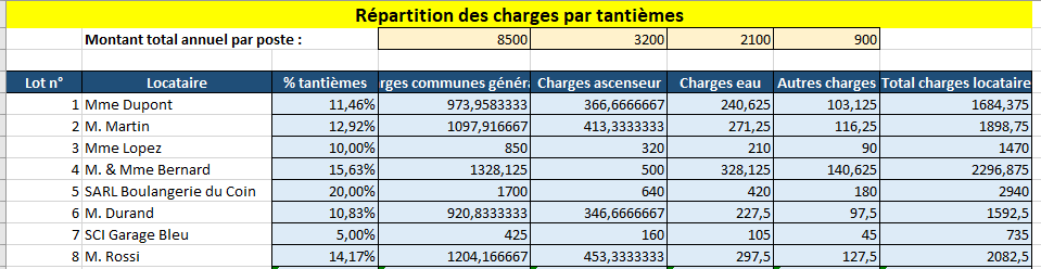 - répartir des charges annuelles (communes, ascenseur, eau, autres) entre les locataires, en fonction de leurs tantièmes.