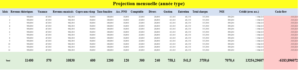 - Charges : copro non récupérable, taxe foncière, PNO, gestion, entretien, divers.