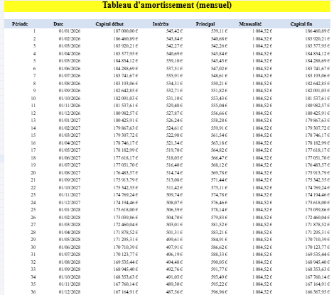 Le tableau d’amortissement vous donne la mécanique du crédit : intérêts, principal, capital restant dû. Cette lecture devient précieuse si vous envisagez :