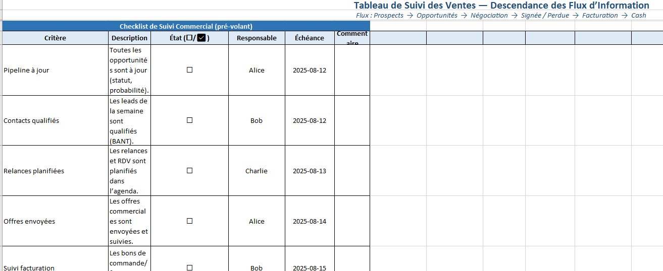 - Checklist commerciale – pour suivre les tâches et actions clés.
