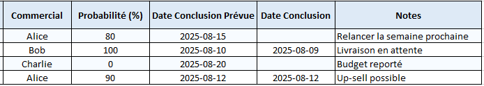 - Utiliser les filtres Excel pour analyser par commercial, par produit ou par date.