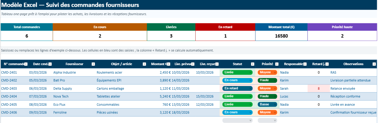- Un modèle pratique pour garder une vue claire sur les commandes en cours, les livraisons attendues et les priorités à traiter