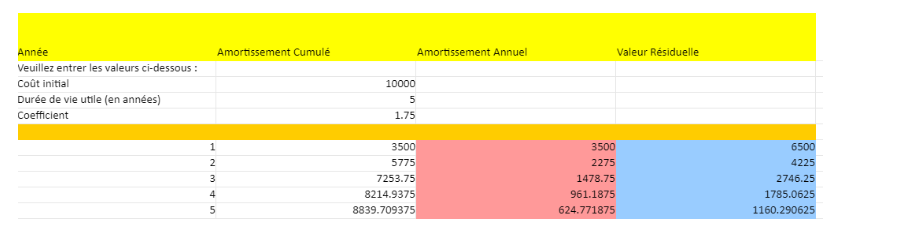 Amortissement (année 1) = 10 000 € * 35% = 3 500 €- Valeur nette comptable après la 1ère année :